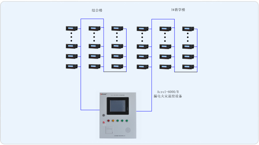 本項目主要是針對上海復旦高等藝術實訓基地內的兩棟教學樓設計電氣火災監(jiān)控系統(tǒng)。在部分樓層配電柜的重要回路安裝安科瑞研發(fā)的ARCM系列剩余電流式電氣火災監(jiān)控探測器,并為其配置一套Acrel-6000/B電氣火災監(jiān)控系統(tǒng),電氣火災監(jiān)控系統(tǒng)實時監(jiān)測重要回路的剩余電流值、箱體回路的實時溫度,監(jiān)測的數(shù)據(jù)實時傳輸至后臺主機,當發(fā)生剩余電流值越限、溫度越限時,后臺能進行聲光報警,同時后臺能夠和消防火災報警系統(tǒng)實現(xiàn)消防聯(lián)動。