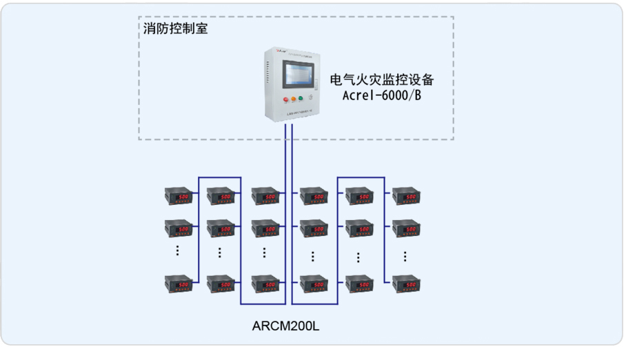 安科瑞于2014年9月承接了該項目電氣火災監(jiān)控系統(tǒng),整套系統(tǒng)由壁掛式電氣火災監(jiān)控裝置安科瑞Acrel-6000/B、ARCM200L剩余電流式火災探測器組成。現(xiàn)場低壓配電柜內探測器采用2條485總線接至消控中心的Acrel-6000/B壁掛式電氣火災監(jiān)控系統(tǒng),當現(xiàn)場保護線路中的被探測參數(shù)超過報警設定值時,發(fā)出報警信號、控制信號,指示報警部位并保存報警信息。