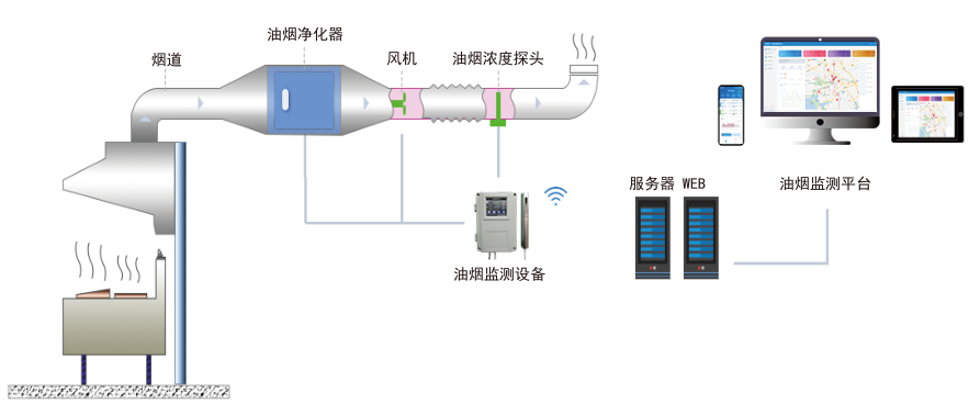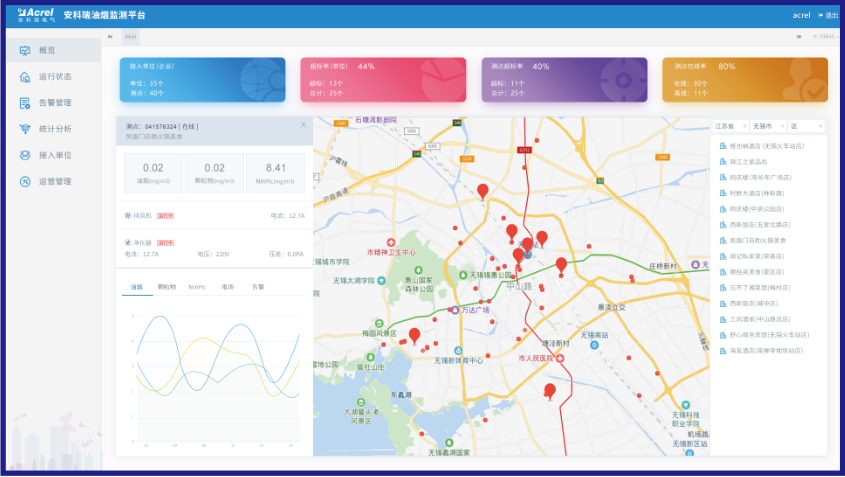 平臺GIS地圖采集餐飲油煙處理設(shè)備運(yùn)行狀態(tài)和油煙排放的濃度數(shù)據(jù),自動對超標(biāo)排放及異常企業(yè)進(jìn)行提示預(yù)警,可迅速進(jìn)行處理,督促餐飲企業(yè)整改設(shè)備,并定期清洗、維護(hù),實(shí)現(xiàn)減排環(huán)保,不擾民等目的。